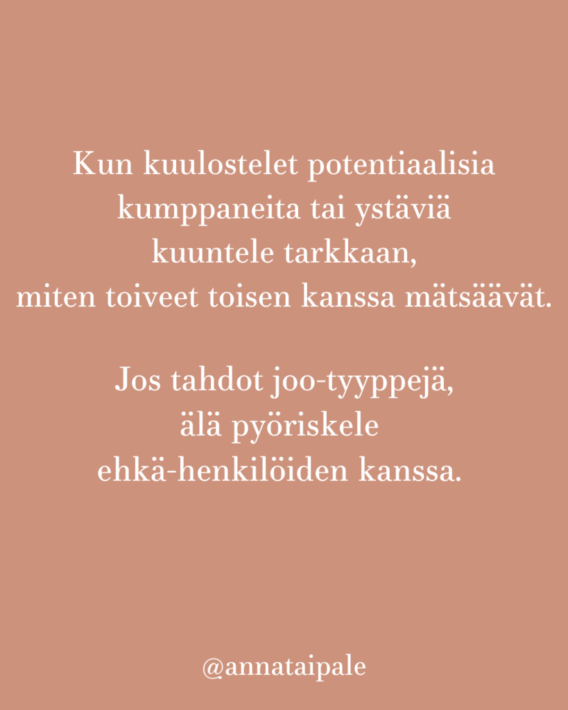 HalooOletko koskaan valinnut vahingossa elämääsi henkilöitä, jotka ovat siinä mutta eivät ihan kuitenkaan? Tai kumppaneita, joiden kanssa tuntuu että tää on ihan jees mutta jotain puuttuu? Tai ihmisiä joiden kanssa on aika kamalaa, mutta …